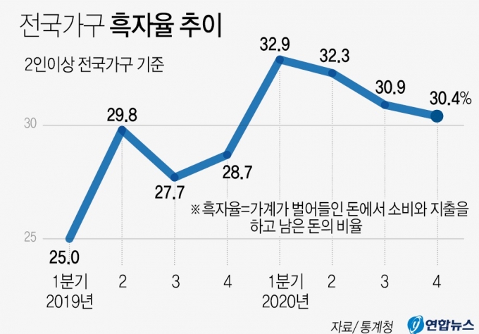 22일 통계청의 가계동향 조사결과에 따르면 지난해 2인가구 이상의 흑자율이 30%를 넘었다. 1분기 32.9%, 2분기 32.3%, 3분기 30.9%, 4분기 30.4%를 기록했다. 흑자율은 가계가 벌어들인 돈에서 소비와 지출을 하고 남은 돈의 비율을 의미한다.