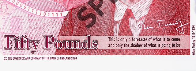 앤드류 베일리 영국중앙은행 총재는 "앨런 튜링이 컴퓨팅과 인공지능(AI)의 분야에서 다진 초석이 현재 우리 삶에 크나큰 영향을 끼쳤다"고 말했다. 영국중앙은행은 앨런 튜링의 업적을 기려 그의 생일인 오는 6월 23일 신권을 발행할 계획이라고 밝혔다.