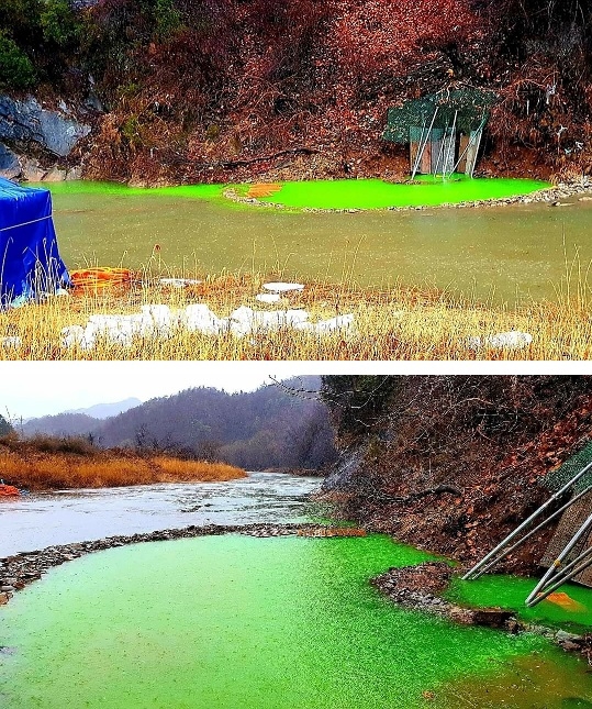 내가 자꾸 문제제기를 하니까, 쌍용이 올 3월에 매립장 예정지 지반의 동공을 확인하겠다며 초록색 형광물질인 우라닌(Uranine)을 부었다. 쌍용은 15년 걸린다고 했는데 우라닌을 부은지 3일만에 쌍용천이 초록색으로 물들기 시작했다. 그 다음날이 되자 서강까지 초록으로 물들기 시작하더라. 이런 곳에 매립장을 지으면 안된다는 것을 스스로 입증한 셈이 됐다.