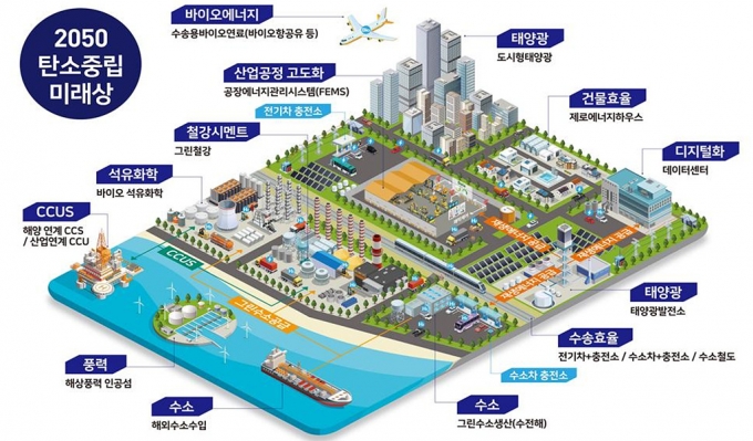 거리를 달리는 자동차들은 거의 전기차와 수소차다. 건물들은 자체 태양광 발전으로 필요한 에너지를 생산한다. 철강, 석유화학 등 탄소배출이 많았던 산업들도 '그린철강' '바이오 석유화학' 등으로 탈바꿈해 환경친화적 산업이 된다.