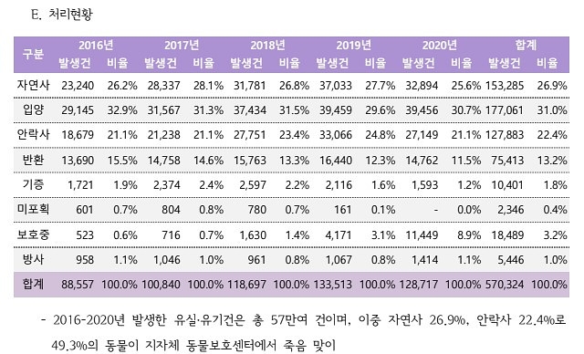 채일택 동물자유연대 정책팀장은 "유실·유기동물을 보호하기 위해 입소시키는데 상해, 질병 등으로 죽음에 이르는 자연사가 전체 입소 동물의 26~28%에 달하는 것은 문제"라며 "발생한 동물에 대한 '관리'에 초점이 맞춰져 있는 현재의 유실·유기동물 대책을 '예방'으로 전환해야 한다"고 지적했다.