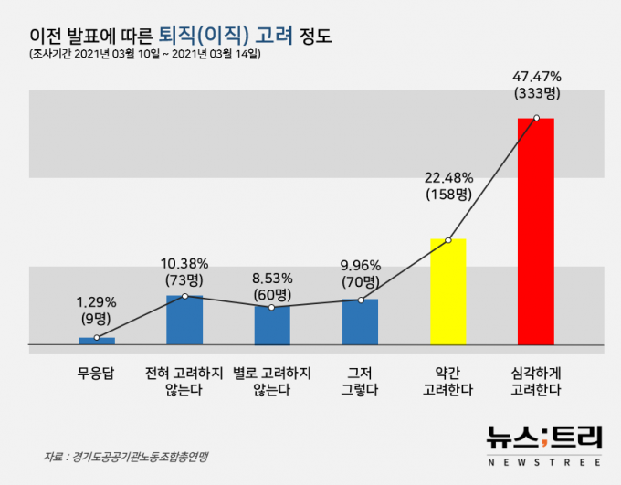 경기도의 공공기관 이전 발표로 인해 근로자의 70% 이상이 퇴직을 고려하고 있고, 상당수는 불안과 좌절감을 호소하고 있는 것으로 나타났다.