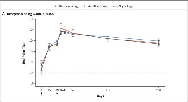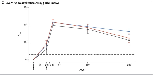 모더나 백신 2차 접종 후 209일째 되는 날 중화 항체의 농도는 모든 경우 50% 이상을 유지했다. 중화 항체 농도가 감소하더라도 기억 세포에 정보가 저장된다. 이 때문에 바이러스 감염시 면역학적 기억이 즉시 발동해 대량의 중화 항체를 신속하게 재차 만들어낼 수 있다.