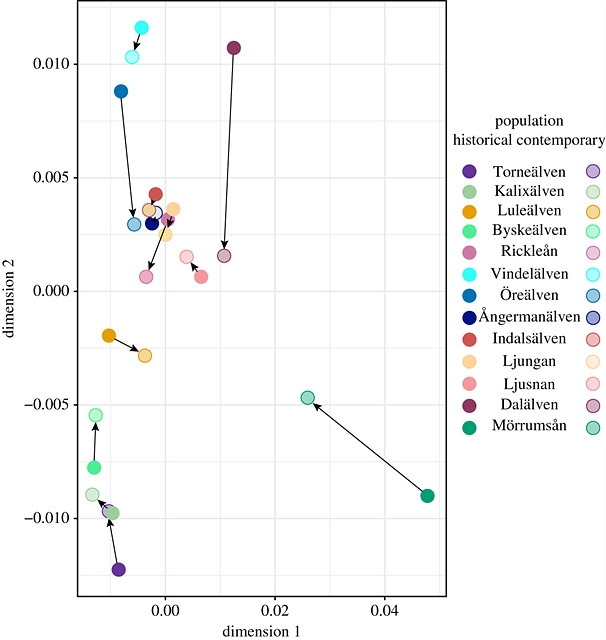 이번 연구는 스웨덴의 13개 하천에 서식하는 연어의 DNA를 추출해 진행했다. 비교군은 크게 2가지로, 지역 어민과 수산 생물학자들이 제공한 1920년대 발트해 연어 비늘 893개와 지금의 연어 샘플 787개다. 현재 13개의 강 가운데 5개 강에 양식 연어가 서식한다.