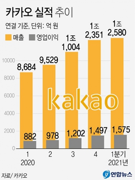 카카오가 6일 공개한 1분기 실적은 연결기준 매출 1조2580억원, 영업이익 1575억원이다. 이는 역대 최대 분기 실적으로, 지난해 같은기간과 비교하면 매출이 45%, 영업이익이 79% 늘었다.