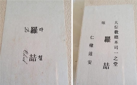 ▲미국에서 독립활동할 때 제작한 명함(좌)과 대종교 도사교 시절의 명함(우)