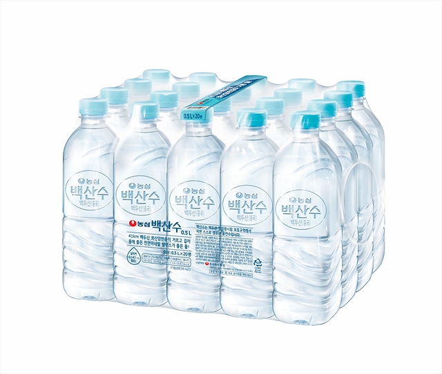 무라벨 '백산수'는 2L와 0.5L 두 종류다. 제품명과 수원지 등 제품에 대한 정보는 페트병에 음각으로 새겨넣었다. 또 제품에 대한 상세정보는 묶음용 포장에 인쇄했다. 이 때문에 무라벨 백산수는 박스 단위로만 판매한다.