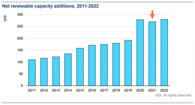IEA는 지난해 이례적인 증가세가 '뉴노멀'로 자리잡아 2022년에 이르면 새롭게 추가되는 에너지 설비용량의 90%가 재생에너지가 될 것으로 내다봤다.