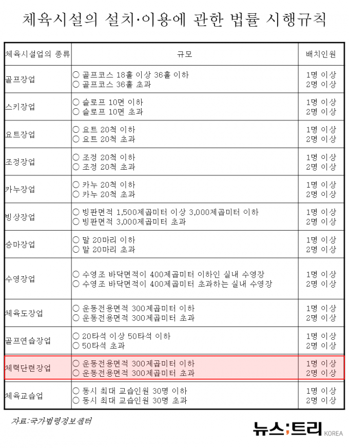 어떻게 체육지도자 자격증이 없는 트레이너들이 회원들을 지도할 수 있을까? 이유는 체육시설 체육지도자 배치기준에 있었다. '체육시설의 설치·이용에 관한 법률 시행규칙'에 따르면 '체력단련장업의 운동전용면적 300제곱미터(㎡) 이하는 1명 이상의 체육지도자를 배치해야 하고 300㎡ 이상은 2명 이상의 체육지도자를 배치해야 한다'고 명시돼 있다.