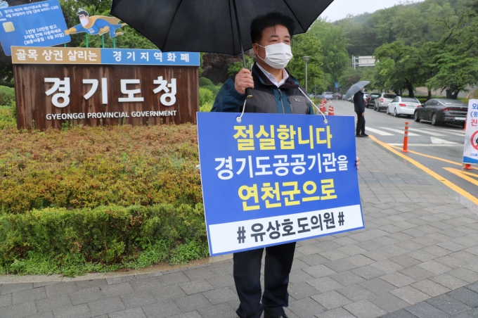 경기도의회 유상호 의원(더불어민주당, 연천)이 21일 경기도청 앞에서 공공기관 이전유치를 위한 1인 시위를 벌였다.