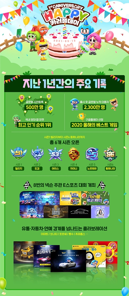이로써 '카러플'은 원작 IP의 인기를 플랫폼, 국경을 넘어 이어가는데 성공하면서 넥슨의 스테디셀러로 입지를 다졌다. 모바일 데이터·분석 플랫폼 앱애니가 발표한 자료 따르면 '카러플'은 지난해 가장 많은 월간 이용자수를 기록한 모바일게임으로 집계됐다. 또 구글플레이에서 선정한 '2020 올해의 베스트 게임' 대상을 차지했다. 생일 당일인 5월 12일에는 1주년 업데이트와 동시에 유저들의 뜨거운 호응을 얻으며 애플 앱스토어 매출 1위에 다시 등극, 식지 않는 인기를 입증했다.