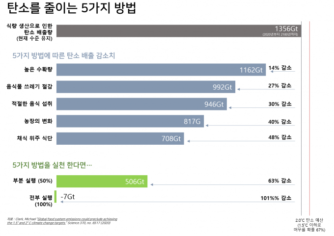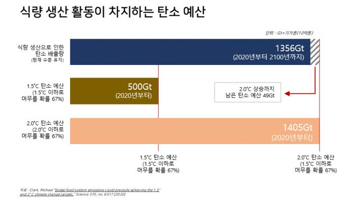 그런데 현재와 같은 방식으로 식량을 생산했을 경우에 2100년에 이르면 1356기가톤의 탄소가 배출될 수 있다는 연구결과는 지구가 회복불가능한 수준으로 온도가 올라갈 수 있다는 경고다. 탄소가 1405기가톤이 배출되면 지구의 온도는 2도까지 상승한다.