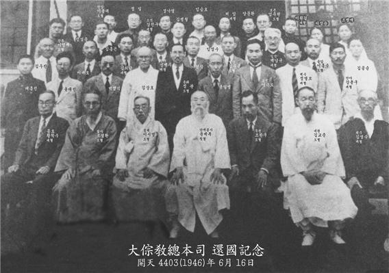 ▲대종교총본사 환국기념 사진. 이 자리에서 재단법인 홍익학원 설립을 논의했다. 홍익대가 첫 둥지를 튼 곳은 지금의 을지로 '중구 저동2가 7번지'다. 지금의 쌍용빌딩 맞은편 주유소 바로 옆자리다. 이곳은 대종교 총본사이기도 했다. 1946년 봄, 대종교 종사 단애 윤세복 선생 일행이 서울에 도착하자, 이흥수 선생과 철기 이범석, 정열모 선생, 고루 이극로 선생 등이 이 장소를 대종교 총본사로 자리잡게 한 것이다.