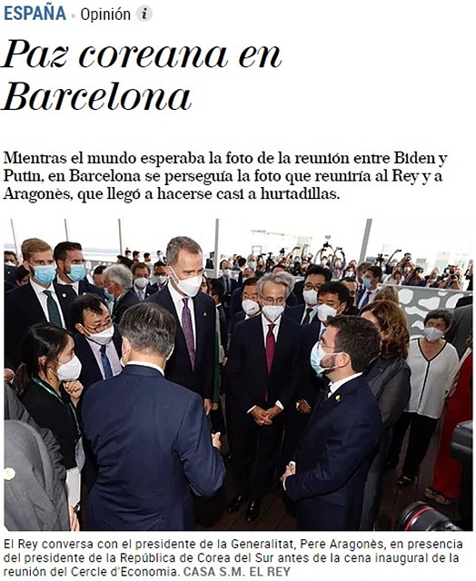 이런 상황에서 지난 16일 '위대한 재건'을 주제로 카탈리냐의 주도 바르셀로나에서 코로나19 이후 무너진 경제를 되살리기 위한 '경제인협회 연례포럼'(Cercle D'economia)이 열렸고, 때마침 스페인을 국빈방문중이던 문재인 대통령이 이 행사에 초청됐다.