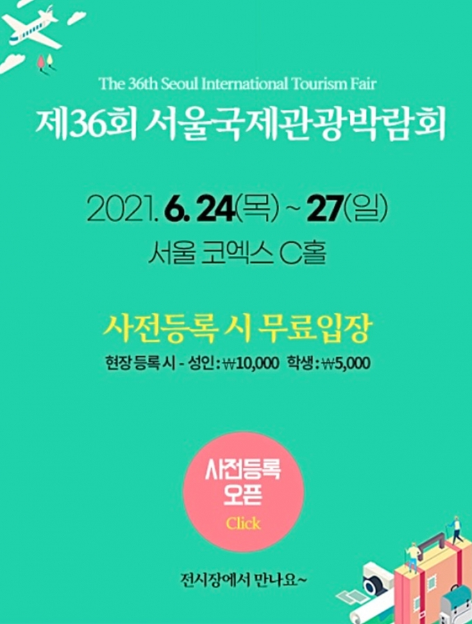 ◇ 제36회 서울국제관광박람회 ·장소 : 코엑스 ·날짜 : 2021년 6월 24일(목) ~ 6월 27일(일) 국내외 최신 관광정보를 한 자리에서 만나는 '제36회 서울국제관광박람회'가 오는 24일부터 4일간 서울 삼성동 코엑스에서 개최된다.