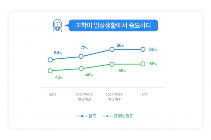 조사에 따르면 코로나19를 겪으면서 한국인들의 과학에 대한 신뢰는 크게 증가했다. 91%의 한국인들이 과학을 신뢰한다고 응답해 코로나19 발생 이전에 비해 11%포인트 높아졌다. 과학이 일상 생활에서도 매우 중요하다는 인식도 86%로 글로벌 평균 56%에 비해 30%포인트 높았다.
