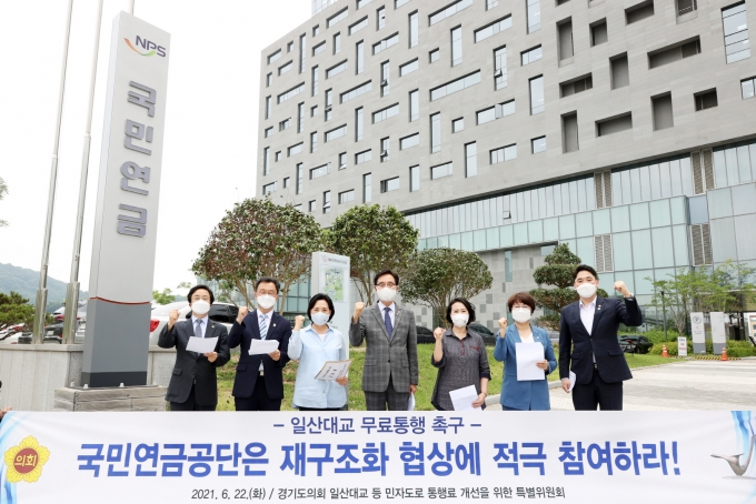22일 경기도의회 일산대교 등 민자도로 통행료 개선을 위한 특별위원회 소속 도의원 7명은 전주시에 위치한 국민연금공단 앞에서 결의문을 발표하고 "일산대교 통행료의 무료화 논의에 일산대교의 대주주인 국민연금공단이 적극 나서달라"고 촉구했다.