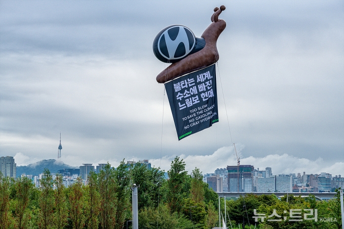 한편 그린피스는 이날 오전 7시경 서울 여의도 한강변에서 현대차의 비전을 비판하는 풍선 퍼포먼스를 벌였다. 한강 옆에서 초대형 달팽이 풍선을 약 20m 상공에 띄운 것이다. 가로 10m 세로 6.5m 크기의 달팽이는 현대차 로고를 짊어지고 느릿느릿 움직이는 형상이었다. 달팽이 풍선에 매달린 커다란 현수막에는 '불타는 세계, 수소에 빠진 느림보 현대', 영문으로는 'Too slow to save the climate, No gasoline No gray hydrogen'(이렇게 느려서는 기후를 구할 수 없다. 내연기관차와 그레이 수소 중단하라!)"는 메시지가 적혀 있었다.