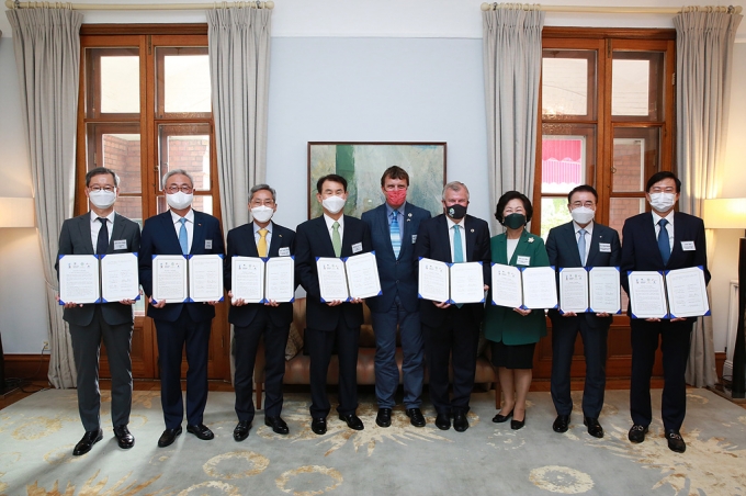 금감원은 13일 오전 주한 영국대사관에서 정은보 금감원장, 사이먼 스미스 주한 영국대사 등이 참여한 가운데 기후리스크 관리모형인 '프론티어 -1.5D' 개발을 위한 업무협약을 체결했다고 밝혔다. 이 자리에는 이화여대, SK이노베이션, CJ제일제당, 삼성바이오로직스, KB금융지주, 신한금융지주 등의 총장과 대표들도 참석했다.