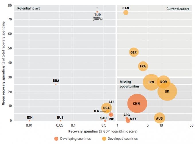 게다가 한국은 녹색 회복 관점에서 '기회를 놓친' 국가로 분류됐다. 한국은 코로나19 극복과 경제 회복을 위해 G20 국가 중 영국에 이어 GDP 대비 두 번째로 큰 비용을 부담했음에도 이 중 30% 이하만 녹색 회복에 쓰였다. 2015년부터 2020년까지 한국에서 태양광 발전이 4배 이상 성장했음에도 여전히 태양광 발전이 전체 발전량의 0.6%에 그친다. 복잡한 인허가 절차, 전력계통의 한계, 바이오매스에 대한 지속적인 인센티브 제공이 재생에너지의 저조한 보급의 원인으로 꼽힌다.