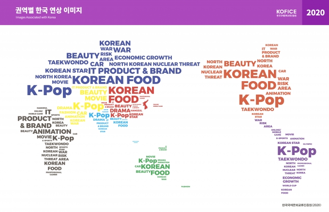 한국국제문화교류진흥원(원장 정길화)이 지난 2015~2020년까지 실시한 '해외한류실태조사'를 바탕으로 한국에 대한 세계인들의 이미지를 형상화한 워드 클라우드(word cloud) 세계지도를 만들었다.