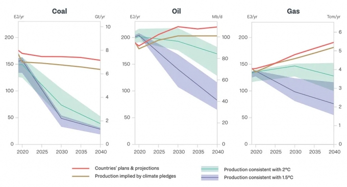UNEP는 2030년에 이르면 파리기후변화협정에서 합의된 '1.5°C 목표'에 부합하는 수치보다 석탄 생산량은 240%, 석유는 57%, 천연가스는 71% 초과 생산될 예정이라고 밝혔다.