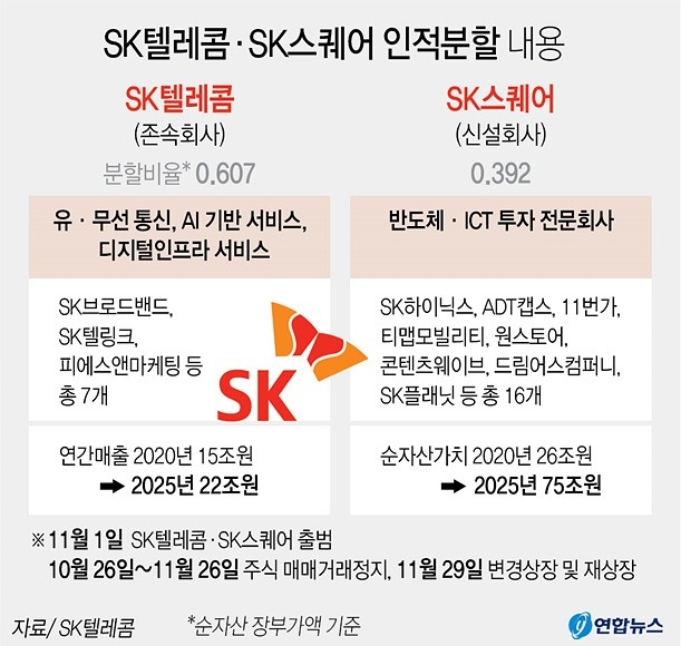 SK텔레콤은 지난달 12일 열린 임시주주총회 의결에 따라 1일자로 통신과 인공지능(AI), 디지털인프라 사업을 담당하는 존속법인 SK텔레콤과 반도체·ICT 투자를 맡는 신설법인 SK스퀘어로 인적분할됐다.
