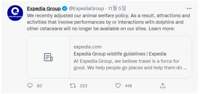 지난 5일(현지시간) 익스피디아는 트위터를 통해 "돌고래·고래를 착취하는 볼거리와 활동은 더이상 우리 사이트에서 이용할 수 없게 될 것"이라며 "포획된 동물들에게 영구적인 생활환경을 제공하는 해양 생추어리 관광상품은 공연이 포함되지 않은 경우 허용된다"고 발표했다. 이어 "고래, 코끼리, 고양이과, 곰, 파충류, 영장류를 포함한 야생·외래 동물과의 신체적 접촉을 허용하지 않는다"며 자사의 달라진 동물복지 정책에 대해 밝혔다.