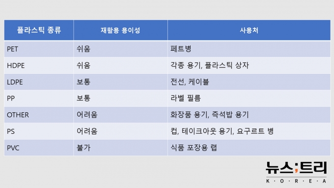 우리나라도 이 기준을 적용해 분리수거제도를 시행하고 있다. 이 중에서 PET와 HDPE, LDPE, PP는 재활용이 수월하지만 PVC, PS, OTHER는 재활용을 하기 어렵거나 불가능한 재질이다.