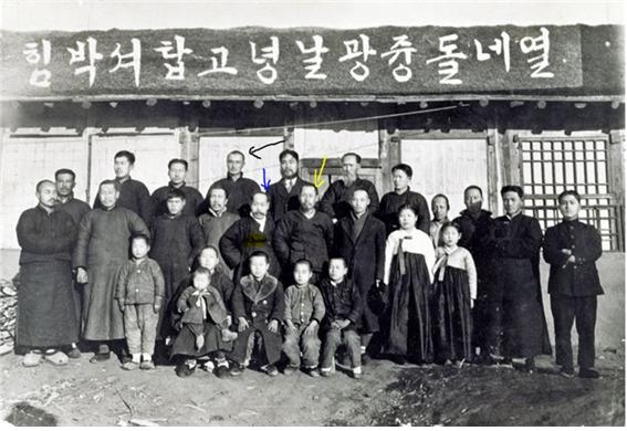 ▲1922년 대종교 만주 영고탑에서 중광절 기념촬영 모습. 파란색 화살표는 무원 김교헌 선생이고, 노란색 화살표는 내원 김교준 선생으로 추정. 1962년 발간된 대한의학협회지 제5권 10호에 따르면, 김교준 선생은 당시를 "양의가 되려는 의도부터 천하게 여긴 시대였으므로 의학교에 입학하게 되자 동네 사람들의 빈축을 받은 일도 있었다"고 회고했다. 당시로선 명문가 출신의 김교준 선생이 신식 의사가 되기 위해 의학교에 입학한 것은 매우 파격적인 일이었다. 의학교에서 최연소 학생으로 3년을 공부한 김교준은 1902년 7월 5일 5등으로 졸업했다.