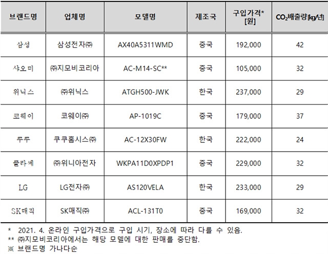 이산화탄소를 가장 적게 배출하는 제품은 쿠쿠 공기청정기로, 연간 24kg으로 나타났다. 배출량이 가장 많은 제품은 삼성 공기청정기로, 연간 42kg에 달해 큰 차이를 보였다. 감전·누전, 필터 유해성분 등에서는 모든 제품이 기준에 적합했다.