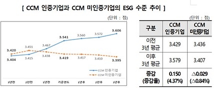 이번 분석은 CCM 인증 기업과 CCM 미인증 기업 등 총 66개사를 대상으로 기준연도 전·후 3년의 ESG를 비교했다. 그 결과, CCM 인증 기업이 미인증 기업보다 ESG 수준이 높았다. CCM 인증 기업은 기준연도 이후 3년간 ESG 평균 점수(3.579점)가 이전 3년간의 평균 점수(3.429점)에 비해 4.37%(0.150점) 상승했다.