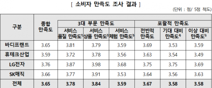 가격과 설치·이전 등 본원적 서비스에 대해 평가하는 '서비스 상품 만족도'는 4개사 평균이 3.84점으로 가장 높았다. 서비스 제공 과정 전반을 평가하는 '서비스 품질 만족도' 평균은 3.78점, 서비스 체험의 긍정·부정 감정의 빈도를 묻는 '서비스 체험 만족도' 평균은 3.59점이었다.