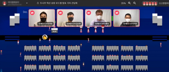 컴퓨터 화면 상단에 꾸며진 무대에는 이석우 대표를 비롯한 두나무측 인사들의 아바타와 영상이 떠 있다. 하단에 마련된 청중석에는 여러 언론 매체 소속 기자들의 아바타들이 좌석에 앉아있다.