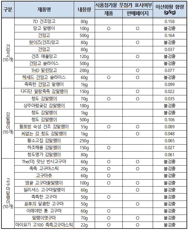 한국소비자원은 시판중인 건망고 10개, 감말랭이 10개, 고구마말랭이 10개 등 건조 과채류 30종을 대상으로 시험검사를 진행한 결과, 전 제품은 이산화황이 검출되지 않거나 기준 이내로 검출돼 적합했다고 21일 밝혔다. 건조 과일류는 1.0g/kg 미만, 서류가공품은 0.03g/kg 미만이 기준치다.