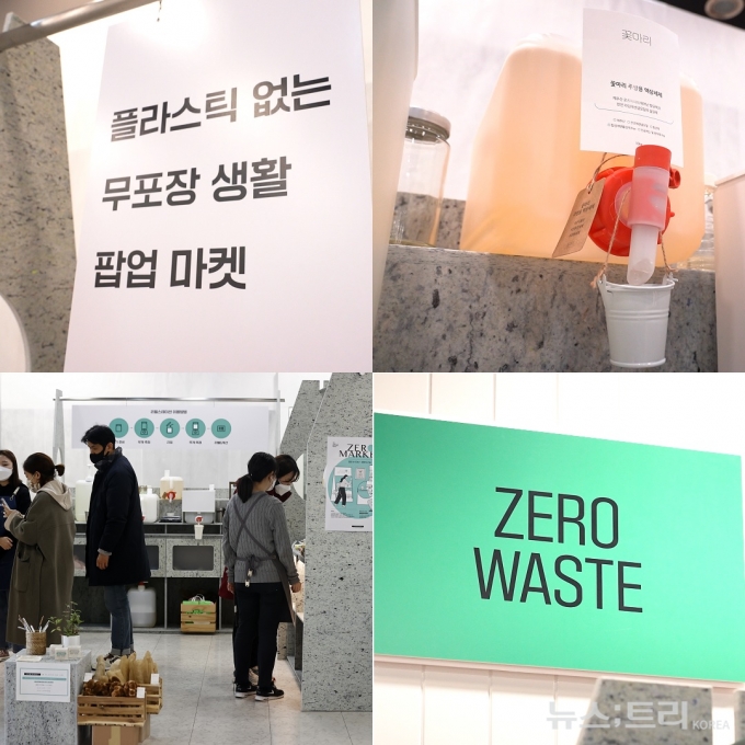 서울시는 대형 유통업체들과 손잡고 유동인구가 많고 접근성·편의성이 뛰어난 백화점·마트 등에 '제로마켓'을 마련하고 6개월동안 시범운영한다. 서울 마포구 홈플러스 월드컵점에 입점해있는 이 제로마켓이 지난 21일 문을 연 1호점이다. 서울시는 홈플러스 월드컵점을 시작으로, 2022년 1월까지 NC백화점 강서점, 지에스프레시(GS Fresh) 고덕그라시움점 등 10곳을 순차적으로 개장할 계획이다.