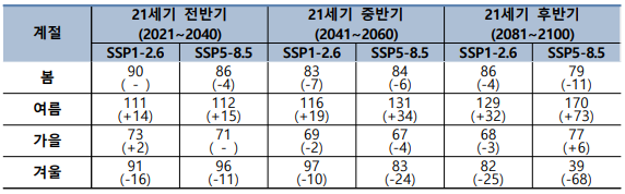 사계절은 사라지고 모든 권역에서 겨울은 짧아지고 여름은 길어진다. 2081~2100년에 이르면 겨울은 3개월 미만으로 축소되고 여름은 4~6개월 동안 지속될 전망이다. 현재 96일이던 여름시기는 170일로 늘어나고, 현재 107일이던 겨울은 기온상승으로 39일로 줄어든다는 것이다. 통상 일평균 기온으로 사계절을 구분하는데, 여름의 시작은 일평균 기온이 20℃ 이상으로 올라간 뒤 떨어지지 않는 첫날이다.