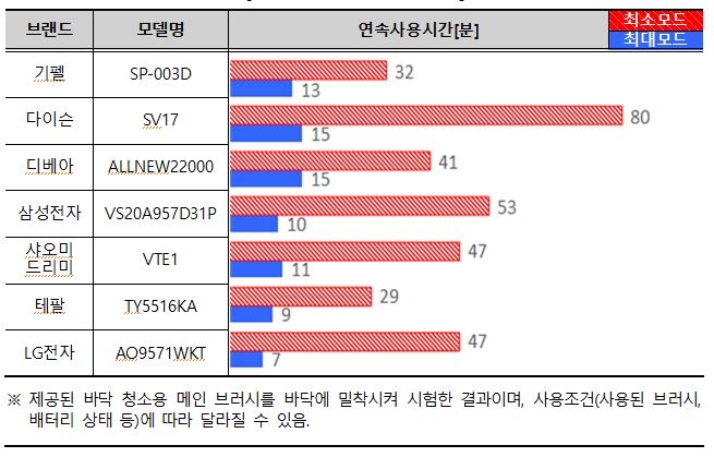 무선청소기 연속 사용시간에서는 제품별로 2배 차이났다. 최대모드에서 많게는 2.1배(7분~15분) 차이가 났고, 최소모드에서 많게는 2.8배(29분~80분)나 차이났다. 최대모드에서 다이슨과 디베아 등 2개 제품은 15분 사용가능했고, 최소모드에서는 다이슨만 80분 사용가능했다.
