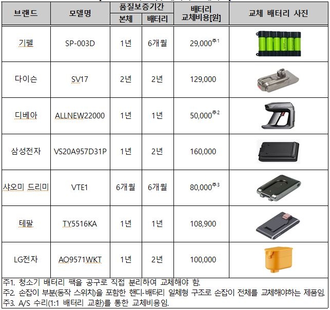 실사용 조건으로 250회 사용 후 최초 사용시간 대비 감소 정도를 통해 배터리 내구성을 평가한 결과, 기펠과 삼성전자, 테팔, LG전자 등 4개 제품은 상대적으로 ʻ우수ʼ했다. 다이슨과 샤오미는 ʻ양호ʼ한 수준이었고, 디베아는 상대적으로 사용시간 감소가 커 '보통'이었다. 배터리 교체비용은 최저 2만9000원에서 최고 16만원으로 약 5.5배 차이가 있었다.