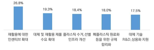 또 상당수 기업은 플라스틱 폐기물을 줄이는데 기업의 참여를 유도하려면 인센티브 확대, 규제 완화와 같은 정책적 뒷받침이 필요하다고 생각하는 것으로 나타났다. 국내 기업들은 플라스틱 문제 해결을 위한 정책과제로 '재활용 활동에 대한 인센티브 확대(26.8%)를 가장 많이 꼽았다. 이어 '플라스틱 대체·재활용 제품 수요 확대'(19.3%), '플라스틱 수거·선별 인프라 개선'(18.4%), '폐플라스틱 원료화 등을 위한 규제 합리화'(18%), '대체 기술 연구개발(R&D) 및 상용화 지원'(17.5%) 순이었다.