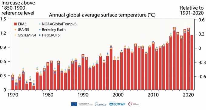유럽연합(EU)의 코페르니쿠스 기후변화서비스(C3S)가 10일(현지시간) 발간한 보고서에 따르면 1850년 기상관측이 시작된 이래 2015년~2021년까지 최근 7년은 역사상 가장 더운 시기였다. 역대 가장 더웠던 해는 2016년이고, 2020년은 두번째로 더운 해로 기록됐다. 지난해는 역대 5번째로 더운 해였다.