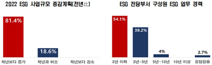 9일 전국경제인연합회가 매출액 상위 300대 기업의 ESG 담당자를 대상으로 조사(86개 응답)한 결과, 81.4%가 작년보다 올해 ESG 사업규모(예산 및 인력기준)를 늘릴 것이라고 답했다. 응답기업의 18.6%는 ESG 사업규모를 전년 수준으로 유지할 것이라 답변했고, ESG 사업규모를 줄이겠다는 기업은 없었다.