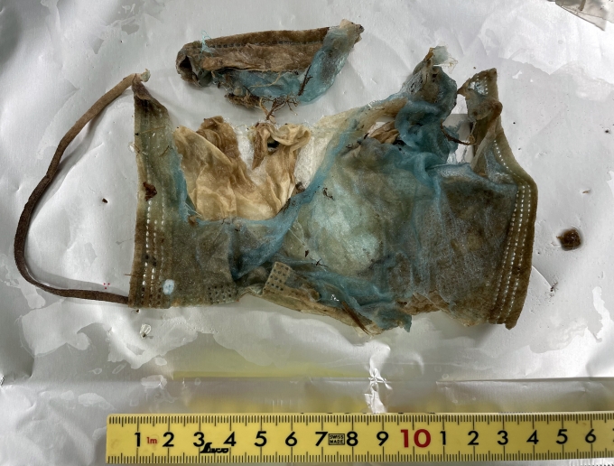 이 거북은 지난해 8월 일본 이와테현 앞바다에서 그물에 걸려 산 채로 발견됐다. 도쿄농공대 연구원은 이 푸른바다거북을 사육하던 중 배설물에서 마스크를 발견했는데 분석해보니 폴리프로필렌으로 제작된 부직포 마스크인 것으로 확인됐다. 폴리프로필렌 성분은 땅에서 완전히 자연분해되기까지 수천년이 걸린다. 폴리프로필렌은 소각과정에서 맹독성 화학물질인 다이옥신을 발생시키기도 한다.