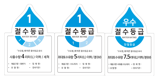 일례로 양변기는 1회 물사용량을 기준으로 절수등급을 구분한다. 1등급(4리터 이하), 2등급(5리터 이하), 3등급(6리터 이하) 등 3단계로 구분된다. 절수등급을 표시하지 않거나 거짓으로 표시한 경우 300만원, 절수형 양변기 자체를 설치하지 않을 경우 500만원의 과태료가 부과된다.