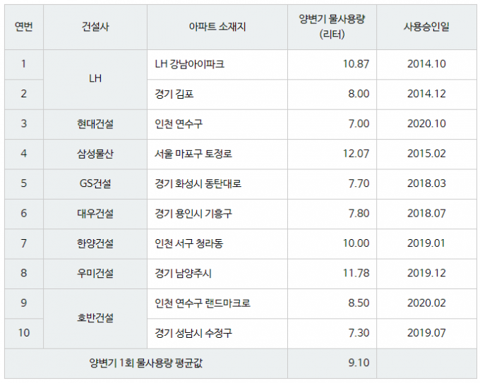 하지만 2020년 10월 사용승인이 난 인천 연수구에 현대건설이 지은 아파트단지에 설치된 양변기 물사용량은 7리터가 넘어 이같은 해명을 무색하게 했다. 게다가 한국YMCA 조사는 수압에 따라 물사용량이 달라지는 '직수형 양변기'가 아닌 '물탱크형 양변기'만을 대상으로 했다.