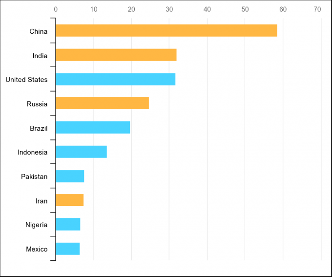 국가별로는 중국이 가장 많은 메탄가스를 배출하고 있는 것으로 확인됐다. 중국의 메탄가스 배출량은 5840만톤으로 1위를 기록했고 인도(3180만톤)와 미국(3150만톤)이 뒤를 이었다. 노르웨이는 가장 적은 양의 메탄을 배출했다.