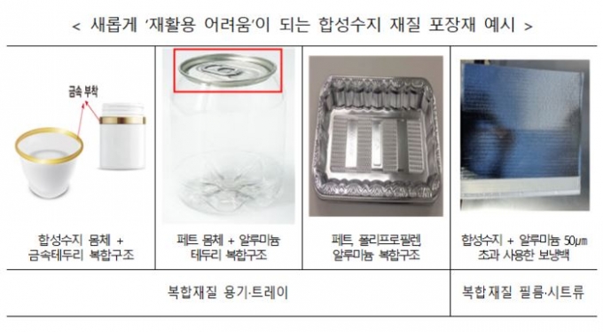 화려하게 보이게 하기 위해 합성수지와 금속재질이 부착된 복합재질을 사용했던 일부 화장품 용기는 '재활용 어려움' 등급이 된다. 또 음료수 포장에 쓰이는 밀봉(캔시머) 용기는 페트 재질 몸체가 알루미늄 재질의 마개와 결합된 형태임에 따라 '재활용 어려움' 등급이 된다. 식품 포장에 쓰이는 합성수지와 알루미늄 재질이 복합된 용기 및 쟁반(트레이)류 포장재도 '재활용 어려움' 등급이 적용된다.