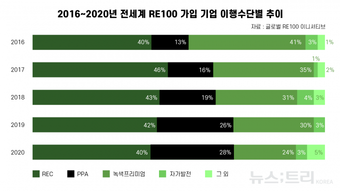 이 때문에 해외의 경우 '추가성'(Additionality)을 갖춘 'PPA 체결' 방식이 가장 실효적 대안으로 떠오르고 있다. 추가성은 재생에너지 발전사업 규모가 실질적으로 확대되는데 얼마나 기여할 수 있을지를 보여주는 지표다. 국제 RE100 이니셔티브의 지난해 연례보고서에 따르면 전세계 RE100 가입 기업들의 이행수단 비중을 놓고 봤을 때 2016년 13%에 불과했던 PPA 비중은 2020년 28%로 꾸준히 오름세를 보이고 있다. 특히 미국의 경우 2016년 이후 누적 PPA 체결 용량은 연평균 60%씩 증가하고 있다.