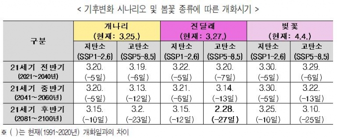 고탄소 시나리오를 적용한 꽃별 개화일 전망을 보면 우선 개나리(현재 3월25일)는 21세기 전반기(2021~2040년)에 3월19일, 중반기(2041~2060년)에 3월13일, 후반기(2081~2100년)에는 3월2일로 당겨질 것으로 보인다. 진달래는 전반기 3월20일, 중반기 3월14일, 후반기 2월28일로 예상된다. 벚꽃(현재 4월4일)은 전반기에 3월29일, 중반기에 3월22일, 후반기에는 3월10일 개화할 전망이다. 특히 개나리가 진달래보다 일찍 피는 것이 일반적인데, 세기말에는 둘이 비슷하게 피거나 진달래가 더 빨리 개화할 것으로 예상됐다.