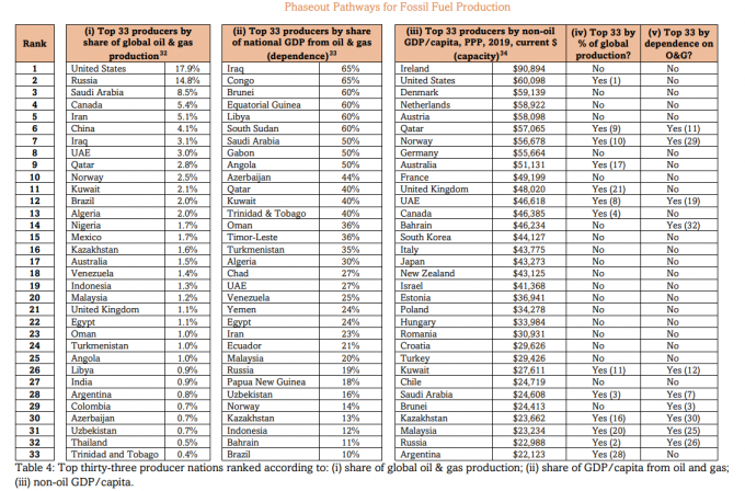 지구 온도상승을 1.5°C로 제한할 확률이 50%라고 가정했을 때, 보고서는 석유를 제외한 1인당 GDP가 5만달러 안팎인 상위 19개국은 2030년까지 화석연료를 74% 감축하고 2034년까지 생산을 중단해야 한다고 분석했다. 미국, 영국, 노르웨이, 캐나다, 호주 및 아랍에미리트가 여기에 해당되며, 이 국가들은 현재 전세계 석유·가스의 35%를 생산한다.